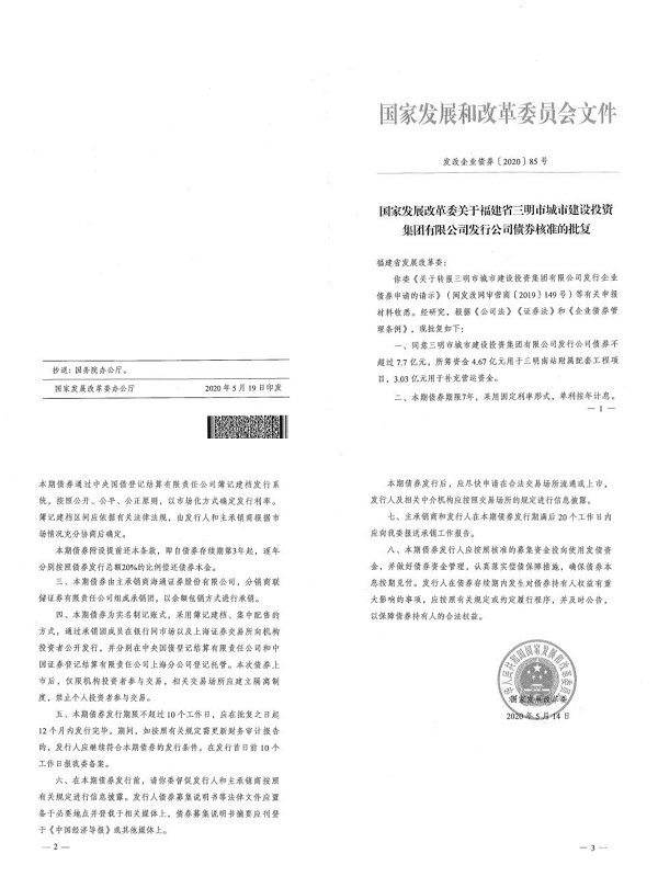 2020年5月21日,三明城投集團申請發(fā)行7.7億元企業(yè)債獲得國家發(fā)改委核準批復,期限7年,募集資金用項目建設及補充公司營運資金。