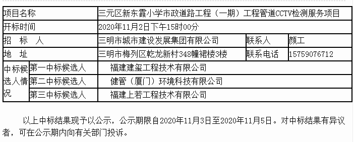三元區(qū)新東霞小學(xué)市政道路工程(一期)工程管道CCTV檢測(cè)服務(wù)項(xiàng)目比選中標(biāo)公示